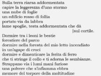 Michele Sovente (28 marzo 1948 – 25 marzo 2011), nato a Monte di Procida, ha insegnato Antropologia Culturale presso l’Accademia di Belle Arti di Napoli e ha collaborato col quotidiano «Il Mattino». Ha scritto in tre lingue diverse: il latino, l’italiano, il napoletano. Queste le sue raccolte: «L’uomo al naturale» (Vallecchi, 1978), «Contropar(ab)ola» (ivi, 1981), […]