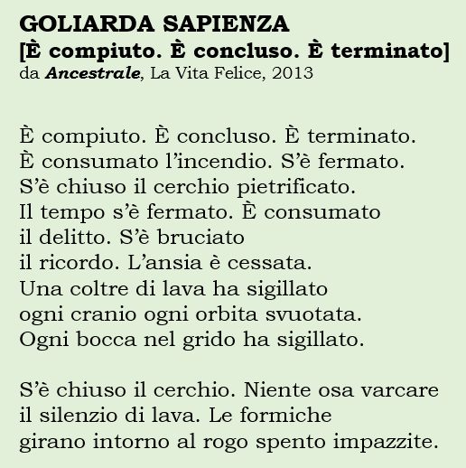 Totalmente inedite sono rimaste, in vita, le poesie scritte durante gli anni Cinquanta. Oggi le possiamo leggere in un volume («Ancestale», La Vita Felice, 2013) curato da Angelo Pellegrino, autore anche della prefazione, mentre la postfazione è affidata ad Anna Toscano di cui cito solo queste poche righe, su cui possiamo concordare: «La scrittura di Goliarda ha una particolarità che la segna e contraddistingue, un segno inequivocabile: in poesia, come in prosa, non è solo asciutta e rigorosa, è di una essenzialità scarna. Le sue poesie sono spesso delle istantanee, degli scatti su una realtà denudata da inutili orpelli, polaroid sulla vita».