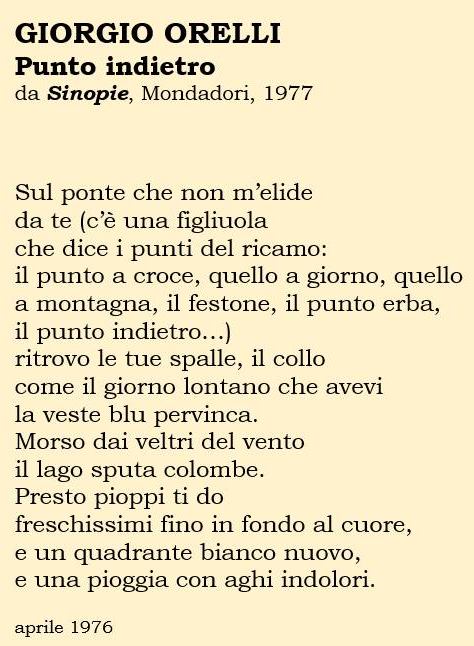 Giorgio Orelli (25 maggio 1921 – 10 novembre 2013), che Contini definì «le meilleur poète suisse de langue italienne», è autore, per citare solo le raccolte maggiori, di «L’ora del tempo» (1962), «Sinopie» (1977), «Spiracoli» (1989), tutte pubblicate da Mondadori, e «Il collo dell’anitra», Garzanti 2001. Del 2015 è il volume che raccoglie «Tutte le poesie», apparso per le cure di Pietro De Marchi negli Oscar Mondadori.
