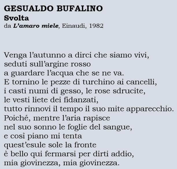 Gesualdo Bufalino (15 novembre 1920 – 14 giugno 1996), grande prosatore («Diceria dell’untore», 1981; «Le menzogne della notte», 1988 – solo per citare due titoli), uomo di straordinaria cultura non solo letteraria ma anche cinematografica e musicale, eccellente traduttore soprattutto dal francese, fu anche un niente affatto trascurabile poeta: «L’amaro miele» (1982, 1989, 1996) raccoglie poesie risalenti agli anni Quaranta e Cinquanta: