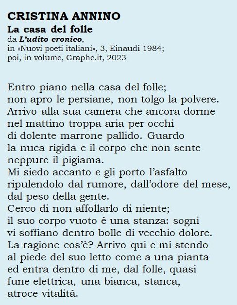 Oggi è il terzo anniversario della morte di Cristina Annino (11 dicembre 1941 – 28 gennaio 2022). Ne pubblico ancora un testo compreso (come quello postato l’11 dicembre scorso) nella raccolta «L’udito cronico», apparsa nel volume collettaneo «Nuovi poeti italiani 3» curato da Walter Siti per Einaudi nel 1984 e ora ristampata nella collana Le mancuspie, diretta da Antonio Bux per le edizioni Graphe.it.