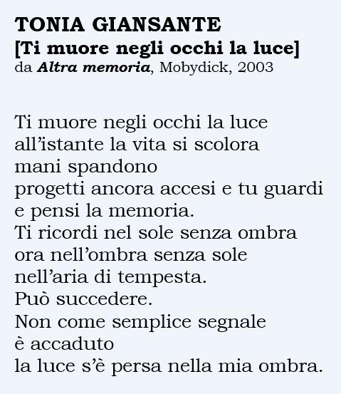 Tonia Giansante (19 settembre 1932 – 4 settembre 2006), abruzzese di Pescara (lancianese di adozione), autrice di racconti, libri di giochi e favole per bambini, ha scritto numerose raccolte di versi: «Per amore» (Itinerari, 1975), «Quando» (Quaderni di Rivista Abruzzese1996), «Quando per amore» (Mobydick, 1997), «Dopotutto è favola» (ivi, 2000), «Amori nel cassetto» (De Luca, 2001), «Altra memoria» (Mobydick, 2003), «Saperlo non soltanto pensiero» (Campanotto, 2003), «Geometrie 1992-2003» (Bastogi, 2005), «La fuga» (Carabba, 2006).