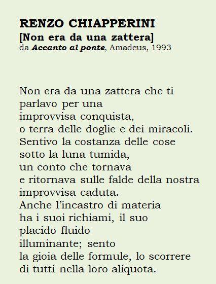 Renzo Chiapperini, triestino ma romano-velletrano d’adozione, è morto nel 1993, troppo presto, e proprio quando la sua poesia aveva raggiunto la piena maturità: meno frenetica e nervosa rispetto agli esordi, più pacata e ragionativa nel tentativo di sciogliere gli enigmi dell’esistenza, più consapevole dei propri mezzi espressivi.