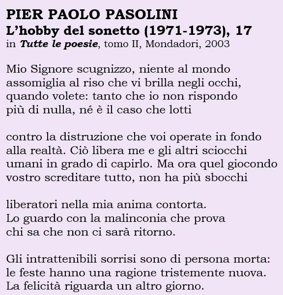«L’hobby del sonetto» è una raccolta di 112 sonetti che però va letta come un vero e proprio poema: poema di disperazione e di lutto, scritto fra il 1971 e il 1973, quando Pasolini – “pazzo di dolore”, come scrisse in una lettera a Paolo Volponi, per l’intenzione di sposarsi che Ninetto Davoli (qui sempre chiamato “mio Signore”) gli aveva dichiarato – si trovò ad attraversare una profondissima crisi: “Ho perso il senso della vita. Penso soltanto a morire o cose simili. Tutto mi è crollato intorno”.