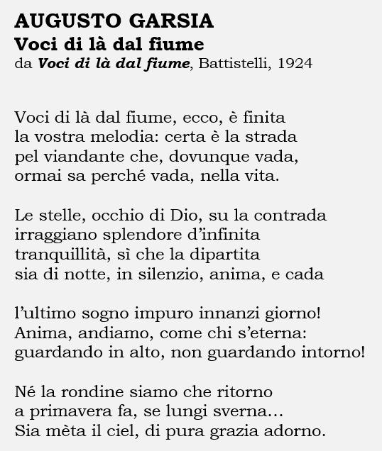 Augusto Garsia (1889-1956) nacque a Forlì, fu professore di lettere nei licei, morì a Firenze. Esordì nel 1911 con «Roma. Una tragedia in tre atti» (Gonnelli, Firenze 1911), poi si dedicò al romanzo («Le strade cieche», ed. La Nave, 1922) e alla poesia: «Opposte voci» (Vallecchi, Firenze 1921), «Voci di là dal fiume» (Battistelli, Firenze 1924), «Poesie (1921-1925)» (Edizioni di “Il Giornale di Politica e Letteratura”, Giusti, Livorno, s.d. [ma 1926]). che comprende anche le due precedenti raccolte. Poi, ancora: «Voci del mio silenzio» (Campitelli, Foligno 1927), «Voci del mio cammino» (Giusti, Livorno 1928), «Le voci. Voci del mio cammino. Antologia di spente voci», Formiggini, Roma 1930.