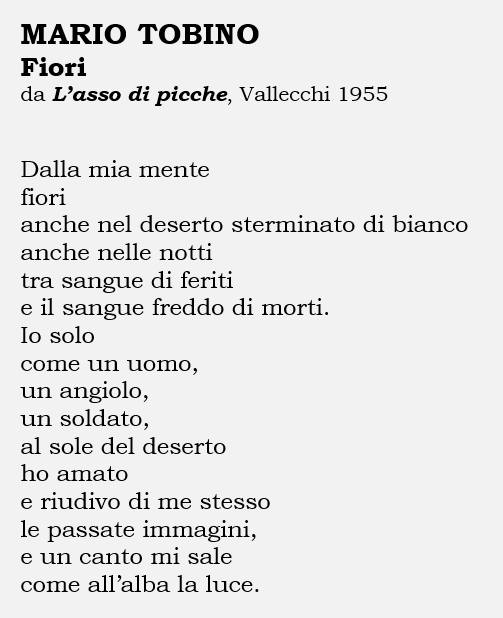 Congeniale a Tobino poeta è la scrittura epigrammatica: rapida, secca, tagliente, incline a un moderato lirismo quando più entra in ballo l’autobiografia nelle sue varie fasi: la giovinezza, la guerra (la poesia che qui propongo è tratta dalla sezione “Libia 1940-’43” di «L’asso di picche»), la Resistenza, le speranze, le illusioni, le delusioni di una vita pienamente vissuta.