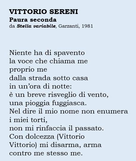 Sereni sapeva che questo, e solo questo, può essere il compito della poesia, ma sapeva anche che la poesia da sola non basta, non ce la fa a vincere la sua partita con la vita («Si fanno versi per scrollare un peso / e passare al seguente. Ma c’è sempre / qualche peso di troppo, non c’è mai / alcun verso che basti / se domani tu stesso te ne scordi»); e tuttavia va fatta, la poesia, e va vissuta, la vita, per dar voce non alle demenziali speranze che ci illudono, ma alle nostre paure e angosce, perplessità e sgomenti, al nostro estremo bisogno di trovarla, una volta o l’altra, la strada giusta: «Guidami tu, stella variabile, fin che puoi…».