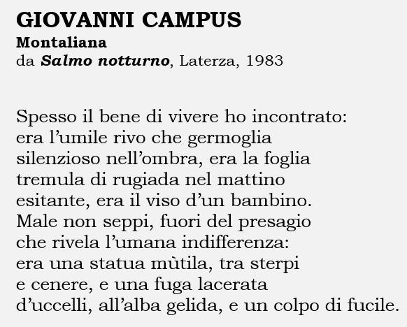 Quella di Campus è una poesia potente, fortemente scandita, con un incedere quasi solenne, comunque sempre controllato. Del suo valore salvifico – di resistenza al male, alle ferite, alle rovine della storia – Campus è incrollabilmente convinto, come afferma in uno splendido, breve testo della sua seconda raccolta: «Questo rimane dell’antica Troia: / il verso del poeta, che solleva il dolore degli uomini sull’onda / del tempo perché nulla / venga dimenticato, perché a tutti / risponda quell’eterno / mistero che ci chiude prigionieri / nella storia del mondo. Ma sul colle / tormentato, trafitto / dalle rovine resta solo il vento».