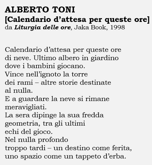 Ed è una considerazione che si può estendere a tutta la poesia di Toni, che con una dizione sempre refrattaria a ogni forma di retorica, senza mai cedere alla tentazione del sublime, cerca di indagare nella propria individuale vicenda collocandola in una più ampia e corale dimensione. Perché le domande che pone, e i dubbi che propone, riguardano tutti.