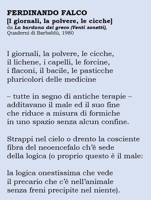 La seconda fase della poesia di Falco coincide con la sua scoperta del sonetto. Lui, che si caratterizzava per quel suo caratteristico verso lungo, fluente, addirittura straripante, libero come più non si potrebbe, si lascia affascinare dalla forma chiusa del sonetto, dando inizio a una stagione di grande creatività che ho avuto l’onore di tenere a battesimo con la prefazione alla sua prima prova in quel campo: «La bardana del Greco» (Barbablù, 1981).