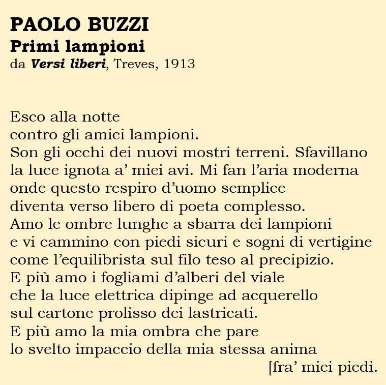 La stagione avanguardista di Paolo Buzzi (15 febbraio 1874 – 18 febbraio 1956), futurista della prima ora, dura dal 1909 al 1915, con due raccolte di poesie («Aeroplani. Canti alati», Edizioni di “Poesia”, 1909; «Versi liberi», Treves, 1913) e un romanzo («L’ellisse e la spirale», Edizioni di “Poesia”, 1915) che, più propriamente, l’autore definisce come «Film + Parole in libertà».