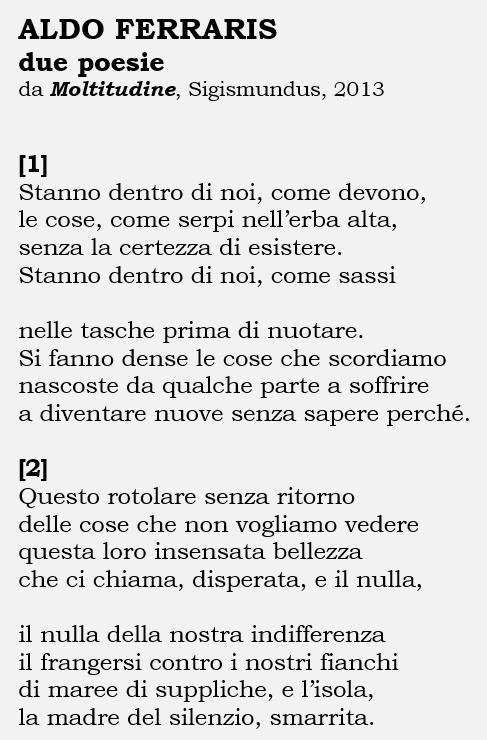 Aldo Ferraris (24 maggio 1951 – 4 marzo 2018), nato a Novara e vissuto sulla Costa Flegrea, è stato autore di filastrocche e racconti per bambini. Ha curato e tradotto il poeta palestinese Kamal Jarbawi («Luce d’epifania», Giuliano Ladolfi Editore, 2011) e pubblicato numerose raccolte di versi: «La cattedrale sommersa» (Rebellato, 1978), «Ventidue mutamenti dell’I King» (Tam Tam, 1987); «Mantiche» (Anterem, 1990); «Codici» (ivi, 1993); «Grande corpo» (ivi, 1997); «Antichissima figlia» (La Luna, 2000), «Acini di pioggia» (Gazebo, 2002); «Nulla sarà perduto» (Archivi del ’900, 2004), «Danza di nascite» (Azimut, 2006); «L’ospite sulla soglia» (Raffaelli, 2009), «Qualunque cosa» (L’Arca Felice, 2010); «Chi non ha avuto perdono» (Kairòs, 2011); «Moltitudine» (Sigismundus, 2013); «Parola a me vicina. Poesie 1972-2008» (Giuliano Ladolfi Editore, 2016).
