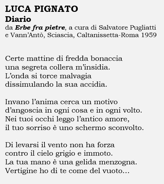 Luca Pignato (8 luglio 1892 – 18 luglio 1955), nato e vissuto a Caltanissetta, insegnò nel locale liceo classico e fu anche direttore del giornale «Cronache nazionali». Pubblicò, in poesia: «Persèfone» (Tipografia Ospizio Provinciale di Beneficenza, Caltanissetta, 1913) e «Pietre» (Gobetti, Torino 1925). Nel 1959 Salvatore Pugliatti e Vann’Antò approntarono per l’editore Sciascia un’antologia delle sue opere: «Erbe tra pietre».