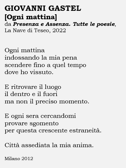 Di Giovanni Gastel (27 dicembre 1955 – 13 marzo 2021), grande fotografo milanese prima attivo nel mondo della moda, poi da ultimo specializzatosi nella ritrattistica (notevole la mostra allestita al Maxxi di Roma nel 2020), La Nave di Teseo ha pubblicato nel 2022 il volume «Presenza e Assenza. Tutte le poesie», con prefazione di Davide Rondoni e postfazione di Anna Radice Fossati Gastel. Scritti in un arco di tempo che va dalla fine degli anni Sessanta del secolo scorso al 2020, questi testi offrono, con le parole della poesia, un ritratto di sé in rapporto agli altri, al mondo, alle gioie e alle ferite della vita, alla paura della morte.