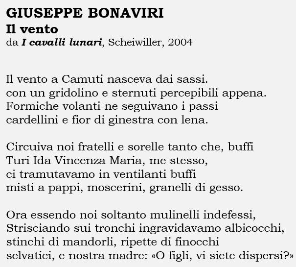 Giuseppe Bonaviri (11 luglio 1924 – 21 marzo 2009) è stato un narratore fortemente radicato nella sua terra d’origine (Mineo, in provincia di Catania), nei suoi miti e riti, nella sua natura arcaica (a partire dal memorabile romanzo d’esordio, «Il sarto della stradalunga», Einaudi, 1954), e poi sempre più attento a scandagliare i misteri dell’esistenza, con lo sguardo rivolto verso l’infinito cosmo di cui noi siamo solo minuscole particelle. E dunque il suo mondo si configura in una dimensione magica, panica, visionaria che non ha altri riscontri nella letteratura novecentesca. Così la sua poesia, che si è sviluppata in alcune raccolte («Il dire celeste», 1976; «O corpo sospiroso», 1982; «L’asprura», 1986; «I cavalli lunari», 2004) che hanno accompagnato le sue opere narrative.