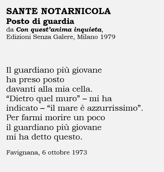 Se digiti su Google il nome di Sante Notarnicola (15 dicembre 1938 – 22 marzo 2021), la prima cosa che leggi è “delinquente e poeta italiano”. Fa un po’ impressione, ma si tratta di una definizione tutto sommato corretta (sempre meglio che: “poeta delinquente”!): Notarnicola è un delinquente – non starò qui a ripercorrerne la romanzesca carriera criminale – che in carcere ha compiuto un lungo percorso di maturazione politica e nella poesia ha trovato una forma di redenzione, cominciando a pubblicare i suoi testi nel 1979 e continuando poi praticamente fino alla morte: «Con quest’anima inquieta» (Edizioni Senza Galere, Milano 1979; nuova edizione, con prefazione di Aldo Nove e postfazione di Goffredo Fofi, Lyriks, Cittanova, RC, 2023), «La Nostalgia e la Memoria» (Giuseppe Maj Editore, Milano 1986), «Materiale interessante. Liberi dal silenzio» (Edizioni della Battaglia / Junk Books, Palermo 1997), «Mutenye, un luogo dello spirito» (Odradek, Roma 2001), «L’anima e il muro» (ivi, 2013), «30 Poesie + 1» (Quaderno Autoprodotto, Bologna 2015), «La farfalla. Versi rubati» (Petite Plaisance, Pistoia 2015), «Versi elementari» (Lyriks, Cittanova, RC 2020).