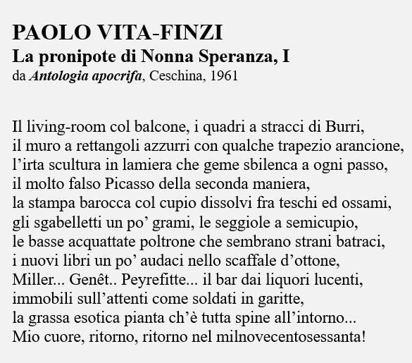 Qui posso solo mostrare un piccolo, piccolissimo esempio: la prima strofa della parodia della gozzaniana «L’amica di nonna Speranza», con un redivivo Gozzano che rinasce nel 1960: un pezzo di bravura straordinario.