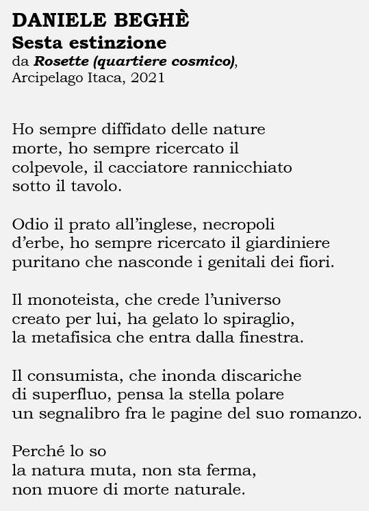 Daniele Beghè (1963 – 8 aprile 2025), nato e sempre vissuto a Parma, ha svolto la sua attività nell’ambito della formazione professionale in campo economico e giuridico. Appassionato lettore di poesia, ha cominciato a scriverne soltanto nel 2007 e ha pubblicato la sua opera prima, «Galateo dell’abbandono», per le edizioni Tapirulan nel 2016. A seguire: «Quindici quadri di quartiere ed altri versi» (Edizioni Consulta Libri e Progetti, Reggio Emilia, 2018), «Rosette (quartiere cosmico)» (Arcipelago Libri, 2021), «Chicane» (Avagliano, 2024).