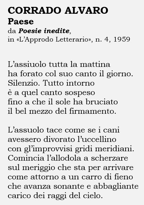 Corrado Alvaro (15 aprile 1895 – 11 giugno 1956), il grande scrittore calabrese di «Gente in Aspromonte» (1930), per citare solo il suo titolo più famoso, ma autore anche di altri memorabili racconti e romanzi, esordì come poeta con «Poesie grigioverdi» (Bernardo Lux Editore, Roma 1917), nate dalla sua esperienza di esaltato interventista che, inviato a combattere sull’Isonzo, a contatto con la morte (lui stesso viene ferito), prende finalmente coscienza dell’assurdità della guerra e ripudia ogni istanza nazionalista.