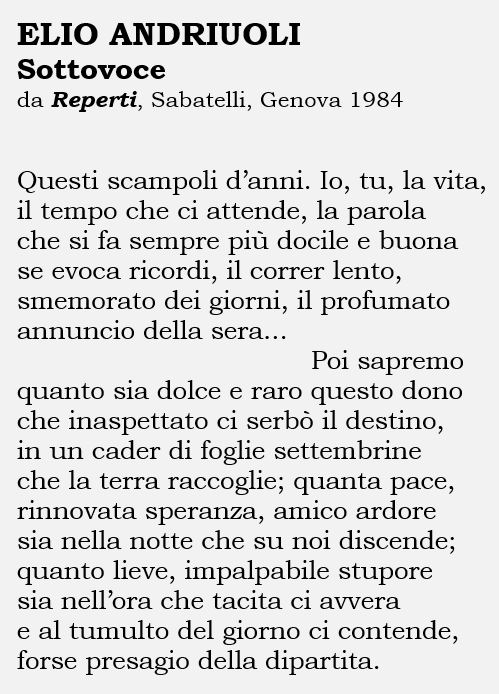 Elio Andriuoli (13 febbraio 1932 – 22 aprile 2024), genovese, insegnante, ha esordito in poesia nel 1960 con la raccolta «Il tuo volo si perde» (Rebellato). Quelle pubblicate fino al 1990 sono antologizzate, con una presentazione di Graziella Corsinovi, ne «La traccia nel labirinto. Poesie scelte, 1979-1990» (Sabatelli, 1991). Seguono: «Epifanie» (Genesi, 1996), «Scirocco» (Libroitaliano, 2003), «Il caos e le forme» (Genesi, 2004), «Per più vedere» (ivi, 2007), «Le vie della saggezza» (De Ferrari, 2009), «L’azzardo della voce» (2a ed. aggiornata, Genesi, 2011).