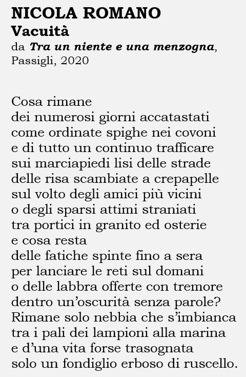 Nicola Romano (25 aprile 1946 – 14 settembre 2022), palermitano, giornalista pubblicista, ha pubblicato numerosi libri di versi: «I faraglioni della mente» (Vittorietti, 1983), «Amori con la luna» (La bottega di Hefesto, 1985), «Tonfi» (Il Vertice, 1986), «Visibilità discreta» (Edizioni del Leone, 1989), «Estremo niente» (Il Messaggio, 1992), «Fescennino per Palermo» (Ila Palma, 1993), «Questioni d’anima» (Bastogi, 1995),« Elogio de los labios» (Carlos Vitale, 1995), «Malva e Linosa. Haiku» (La Centona, 1996), «Bagagli smarriti» (Scettro del Re, 2000), «Tocchi e rintocchi» (Quaderni di Arenaria, 2003), «Gobba a levante» (Pungitopo, 2011), «Voragini ed appigli» (ivi, 2016), «Birilli» (Edizioni dell’Angelo, 2016), «D’un continuo trambusto» (Passigli, 2018), «Tra un niente e una menzogna» (ivi, 2020) e infine, postumo, «Al centro della piena» (Il ramo e la foglia», 2023).