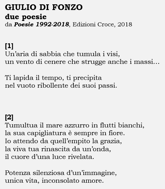 Giulio Di Fonzo (1956-2022), romano, ha insegnato Letteratura Italiana Moderna e Contemporanea all’Università di Tor Vergata. Numerose le sue monografie critiche (su Sandro Penna, Giacomo Leopardi, Albino Pierro, Ugo Foscolo, D’Annunzio, Rosselli e altri autori, cinquecenteschi e contemporanei. In poesia, ha pubblicato: «I disegni della luce e della notte» (Edizioni del Leone, 2003), «Elegie» (Edizioni del Leone, 2012), «Poesie 1992-2018» (Edizioni Croce, 2018) e, postumo, «Il mattino ritrovato» (ivi, 2023), con una postfazione di Roberto Mosena in cui si legge: «Nell’intervista rilasciata poco dopo l’uscita di “Poesie. 1992-2018” Giulio Di Fonzo ha precisato: “Non amo la poesia che si confonde con la prosa o si lascia andare a incontrollate effusioni interiori o a sterili giochi verbali”. In effetti, come ho rilevato in altre occasioni, la poesia di Di Fonzo si è ricavata in questi anni un posto tutto suo, lontano dal facile andamento prosastico o dalle spericolate acrobazie verbali di tanta poesia odierna che spesso riesce solo a suscitare un vuoto effetto di stupore, una breve meraviglia perlopiù priva di reali contenuti e, dunque, più preoccupata della forma che del senso di un’avventura poetica. Più ancorato ad una poesia di tipo tradizionale o classico, Di Fonzo affida ad un bagaglio rigoroso e discreto di artifici retorici, metrici, lessicali (quest’ultimi molto selettivi) la sua storia di poeta, estraneo alle urgenze di chi ad ogni riga (più che ad ogni verso) sente il bisogno di innovare».